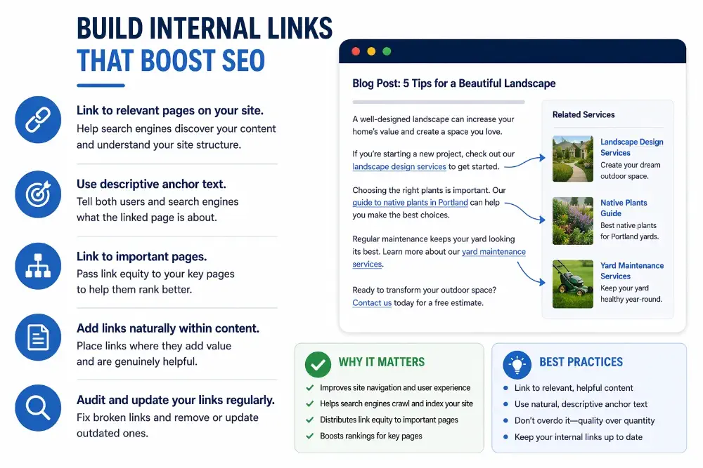 For small businesses, the approach is straightforward. Every blog post should link to at least one relevant service page. Every service page should link to supporting content. Your most important pages — the ones you most want to rank — should receive internal links from multiple other pages across your site.