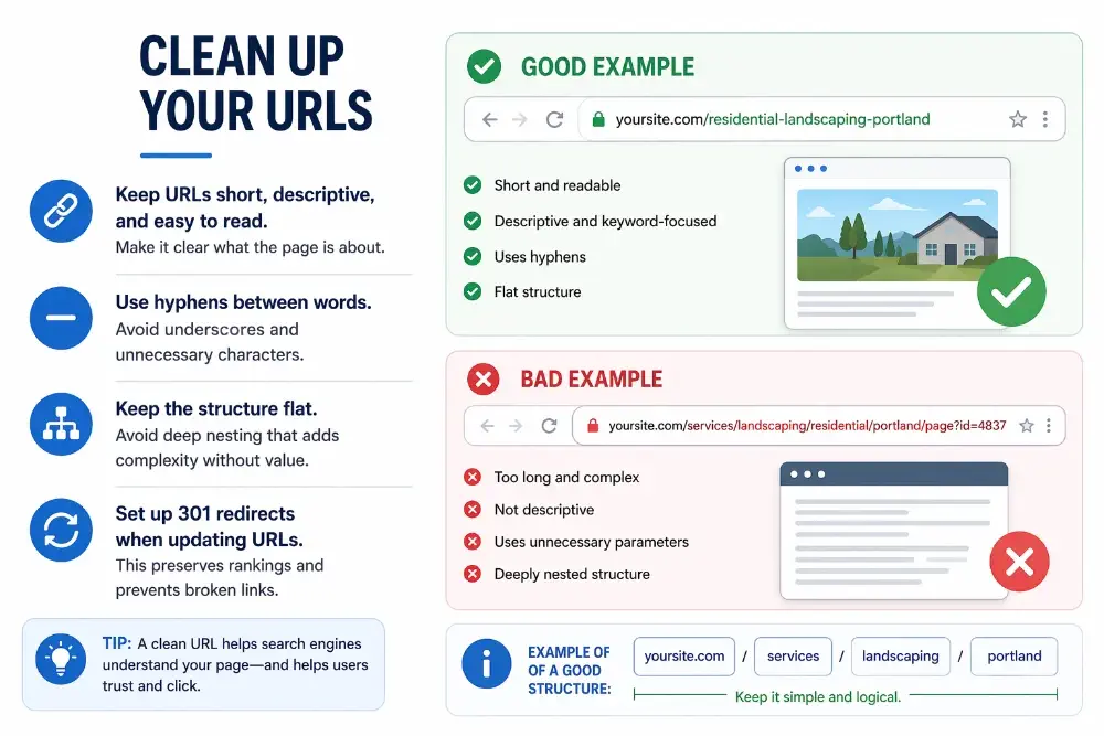 Your URL structure should be short, descriptive, and easy to read. A URL like yoursite.com/residential-landscaping-portland communicates the page topic to both search engines and users. A URL like yoursite.com/page?id=4837 communicates nothing.