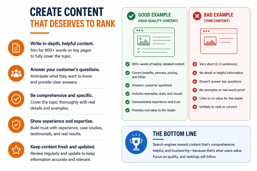 Thin content is one of the most common problems on small business websites. A service page with two sentences and a phone number doesn’t give Google enough to work with — and it doesn’t give your potential customers enough reason to trust you.