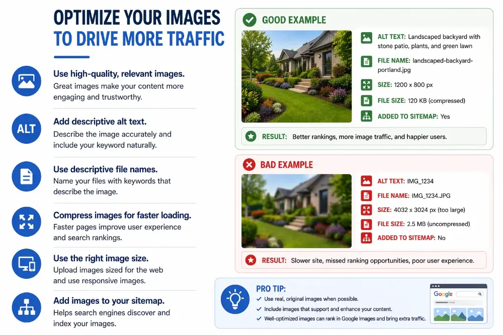 Images are easy SEO wins that most small businesses overlook entirely. Every image on your site has an alt attribute — a short text description that tells search engines (and screen readers) what the image shows.