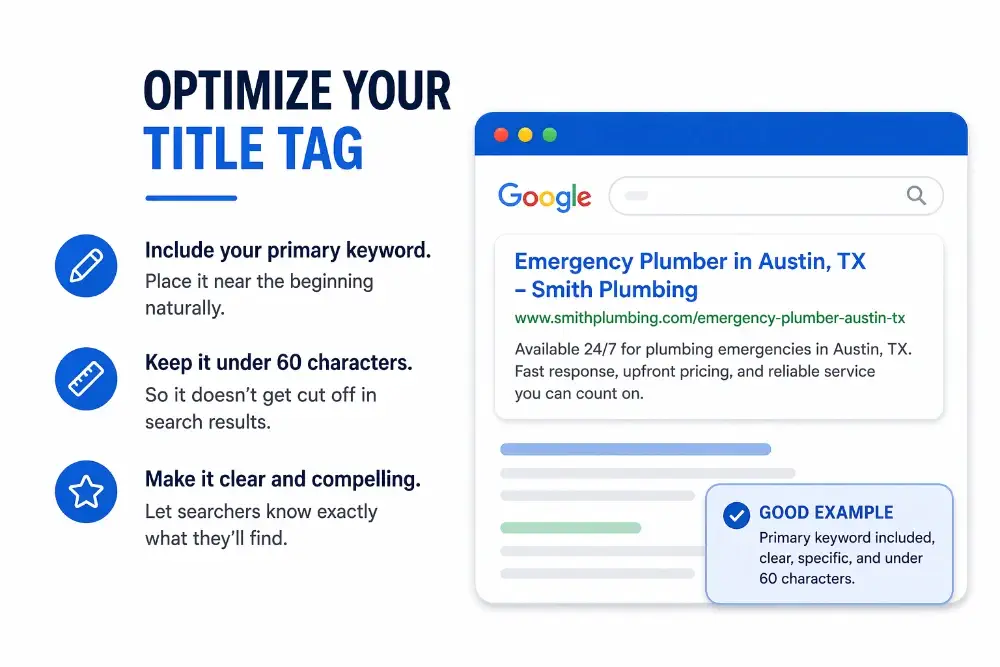 A title like “Home | Smith Plumbing” wastes one of your best ranking opportunities. Something like “Emergency Plumber in Austin, TX — Smith Plumbing” does the work the title tag is supposed to do.