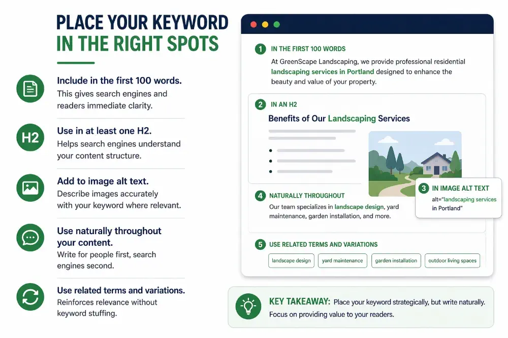Beyond that, use it naturally throughout the body content, in at least one H2, and in your image alt text where it’s relevant and accurate. Don’t stuff it into every sentence — that backfires. Google’s systems are sophisticated enough to recognize keyword stuffing, and readers find it annoying.