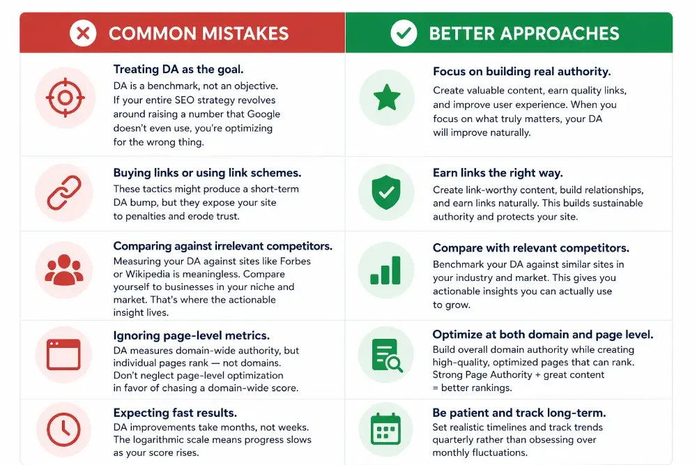 DA is a benchmark, not an objective. If your entire SEO strategy revolves around raising a number that Google doesn’t even use, you’re optimizing for the wrong thing. Focus on the work that builds real authority and the score will follow.