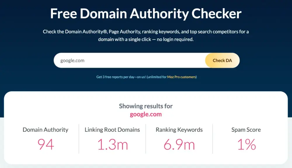 You can check your DA using several tools. Moz’s free Link Explorer is the most direct option since Moz created the metric. Enter your domain, and you’ll see your DA along with data on linking root domains, inbound links, and spam score.
